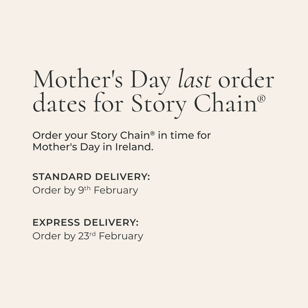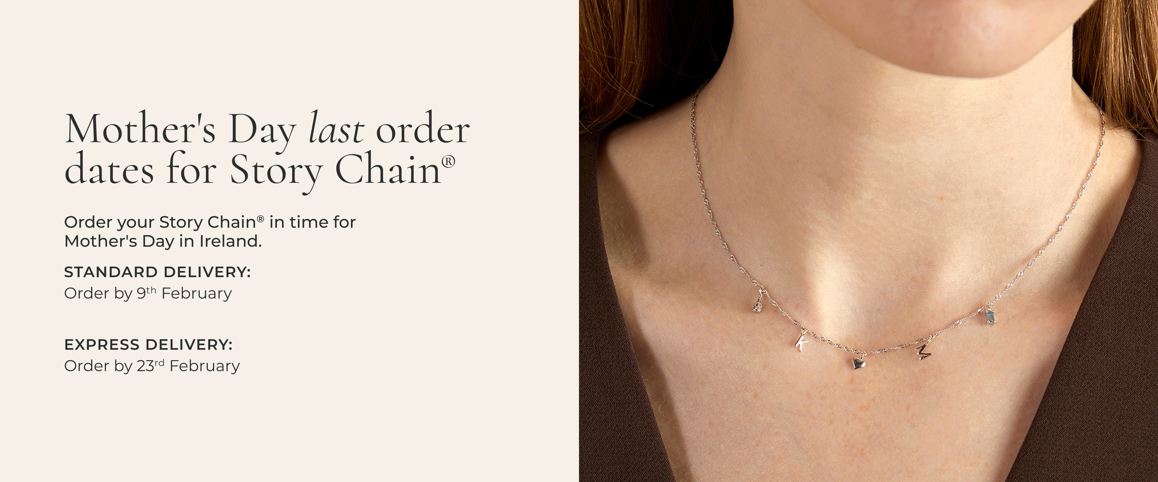 Start your Story Chain® on our visual online builder, or book a Consultation in an A&M store for a one-on-one appointment with a jeweller. As this is a personalised service you'll receive your Story Chain® after four weeks with no additional charge for Standard Service.However, if you need your piece earlier for a special day, you can choose the two week Express Service and pay €45 to get your story chain sooner.